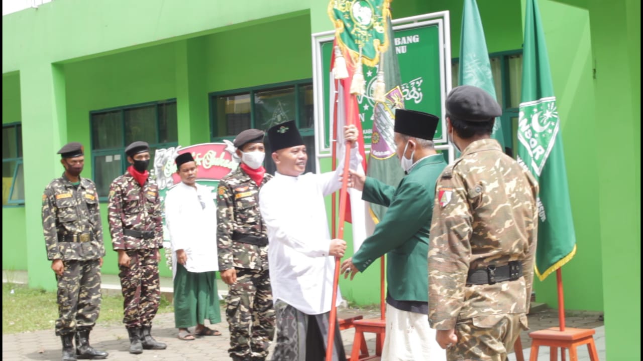 Ketua PCNU Ciamis, KH. Arief Ismail Chowas menyerahkan bendera dan Panji NU kepada peserta Kirab Resolusi Jihad di Halaman Kantor PCNU Ciamis, Jum’at, 25/10/2021.