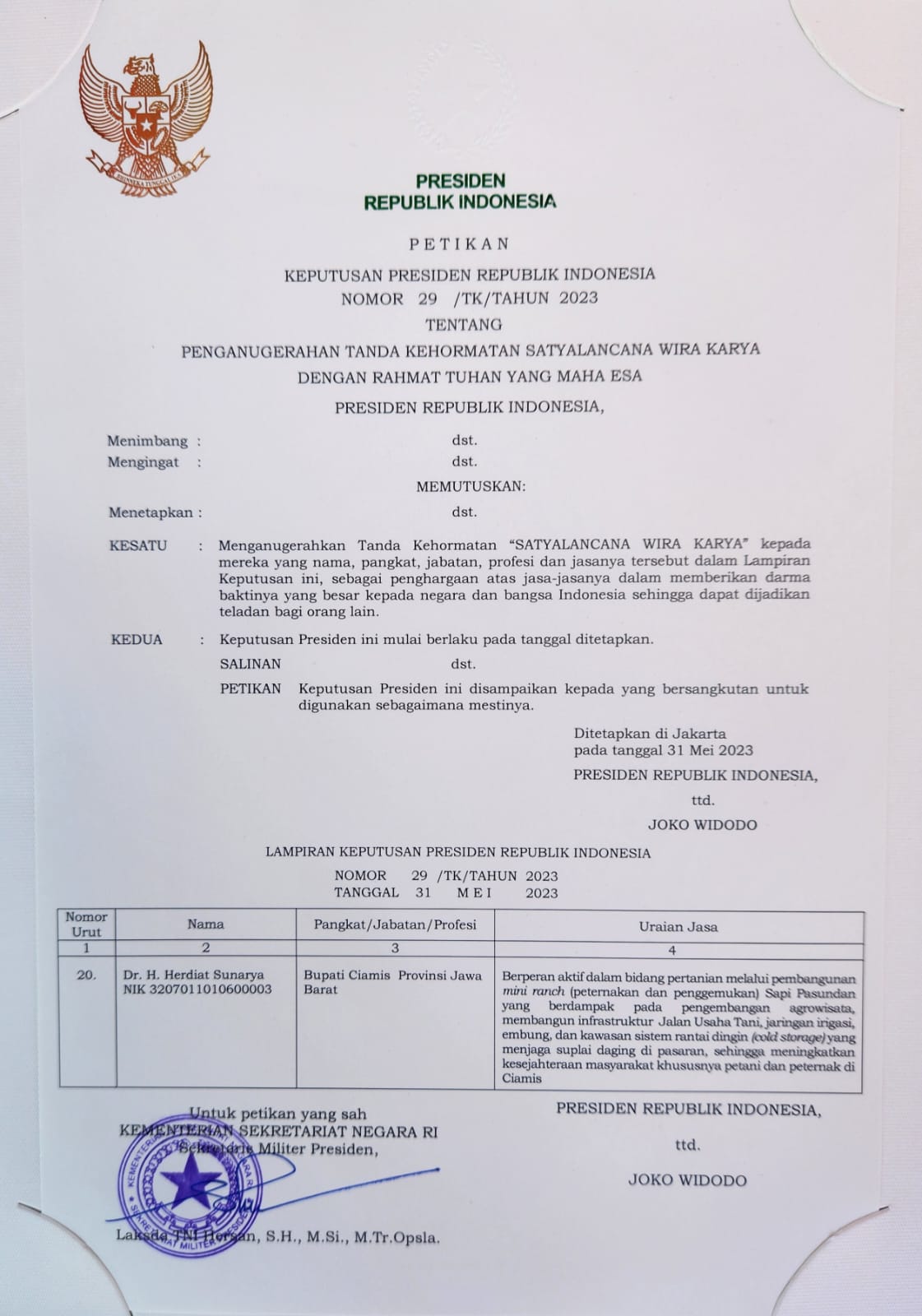 Kabupaten Ciamis,- Seolah tak pernah kering prestasi, Bupati Ciamis Herdiat Sunarya kembali menyabet penghargaan dari Presiden Republik Indonesia Ir. Joko Widodo berupa tanda kehormatan Satya Lencana Wira Karya Bidang Pembangunan Pertanian.